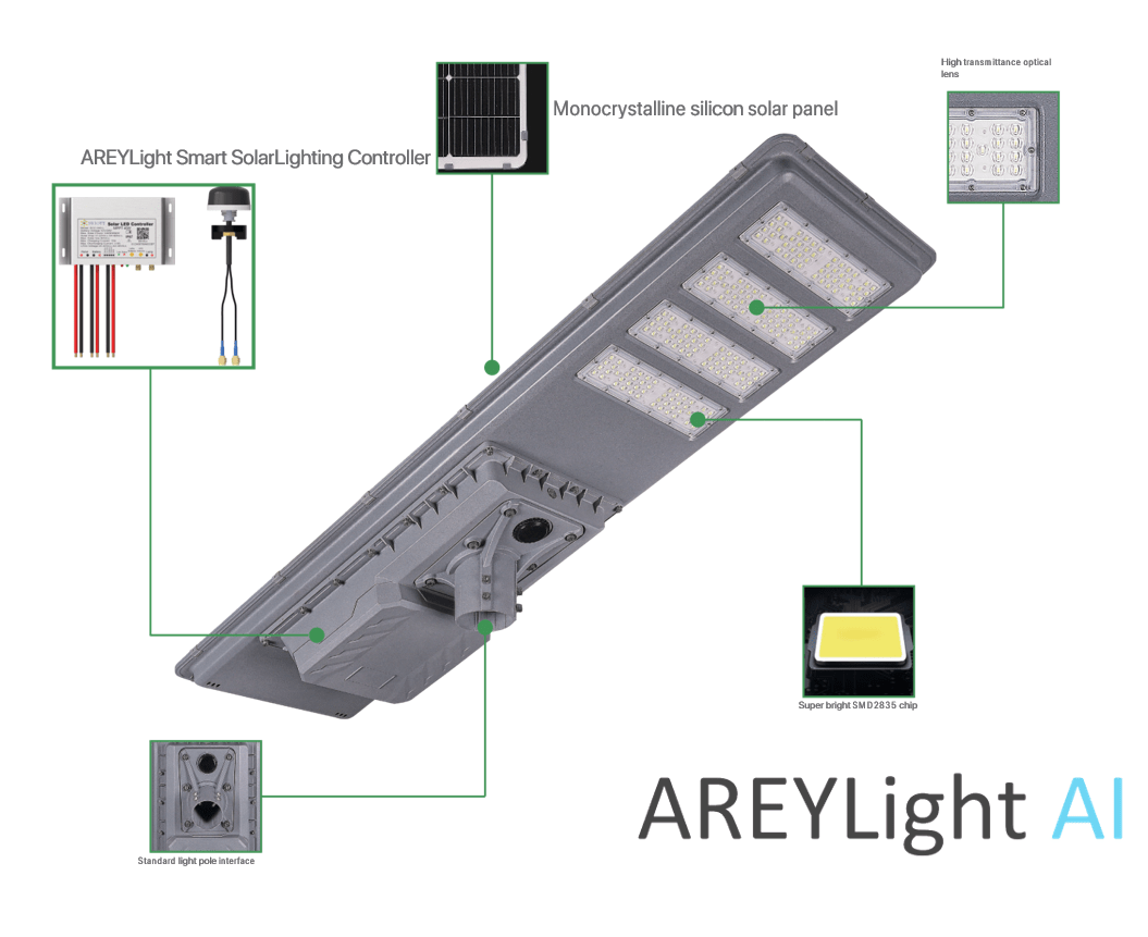 3Revolutionize your public lighting with AREYLight AI’s all-in-one smart solar LED panel — a fully integrated, intelligent street lighting system that combines solar energy, motion detection, battery management, and edge-AI-powered control, connected over LoRaWAN / NB-IoT / GSM communication networks.